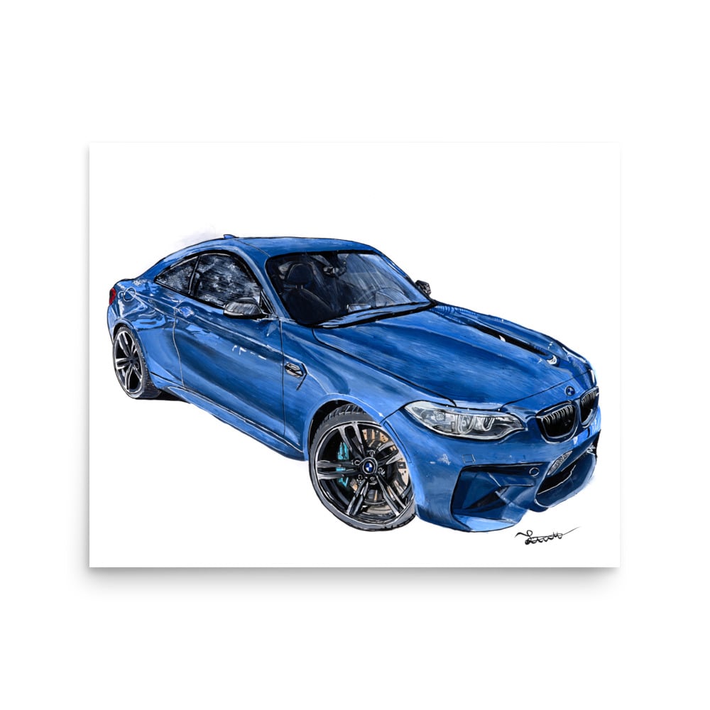 This painting of the BMW M2 was completed for a high following influencer @noteworthyexotics. Every brush stroke captures the car exactly how it feels in real life -its power, speed, and sporty personality. Every detail was painted with focus and dedication as this took me around 30 hours to complete. (Museum-quality thick matte paper.)